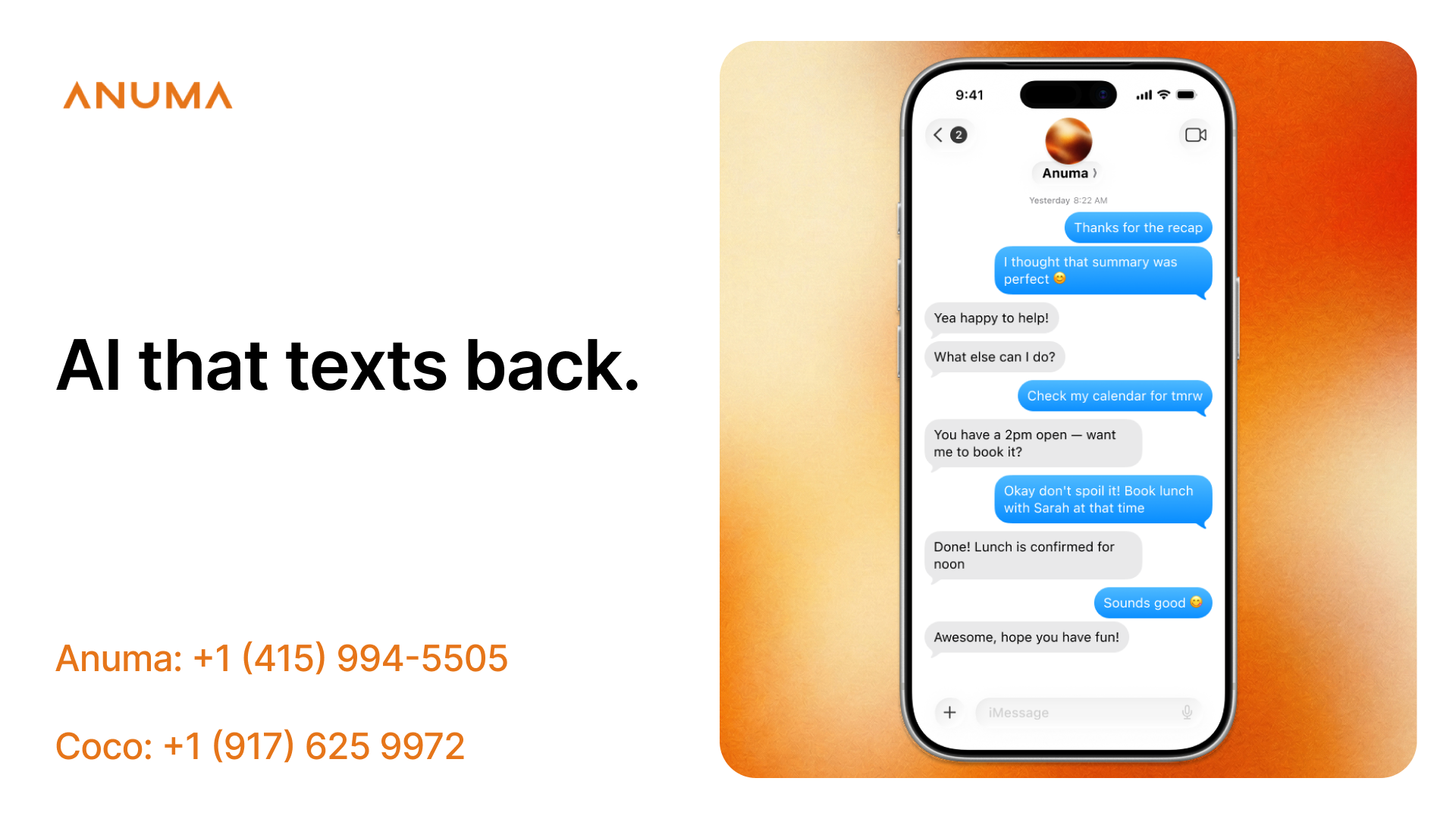 - Save the numbers. Add Anuma and Coco to your contacts. That's it. Works on any phone and any carrier.